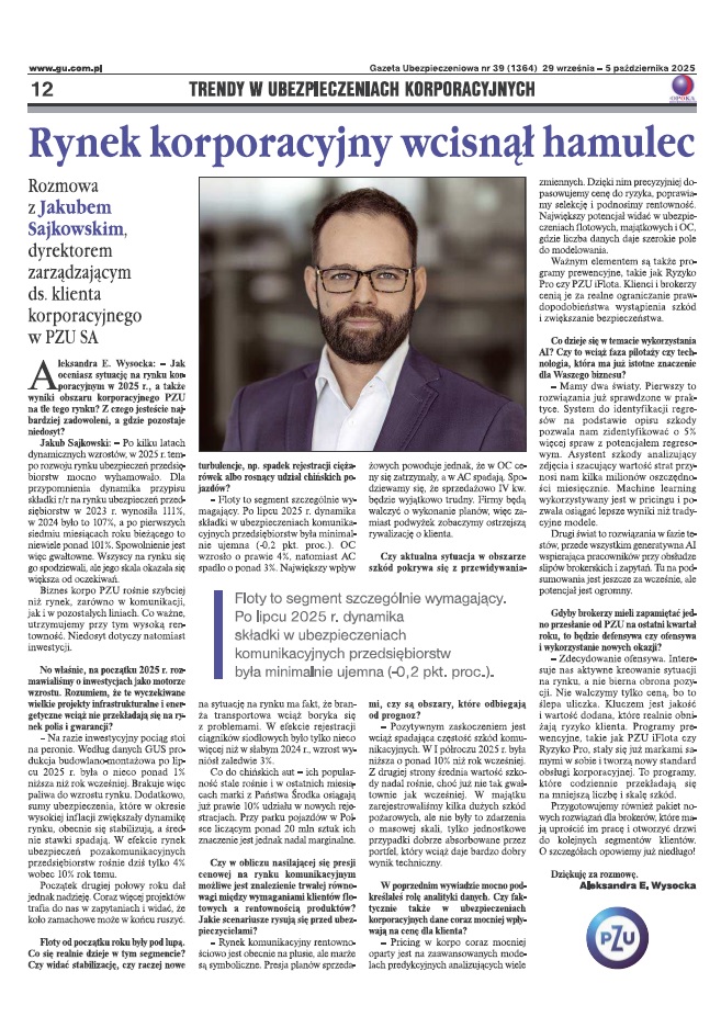 Gazeta Ubezpieczeniowa - rozmowa z Jakubem Sajkowskim Jakub Sajkowski, dyrektor zarządzający ds. Klienta Korporacyjnego w PZU |