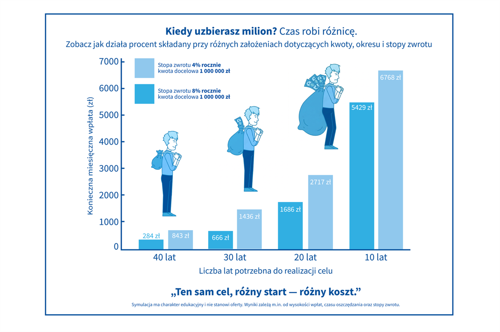 Im później startujesz, tym trudniej nadrobić stracony czas i bardziej musisz nadrabiać - wyższymi wpłatami lub większą presją – kosztem są wyższe wpłaty i większa presja, by szybciej zbudować potrzebny kapitał. Aby uzbierać takie same pieniądze wystarczy często dużo niższa miesięczna “składka”, jeśli decyzję podejmiesz wcześniej.
